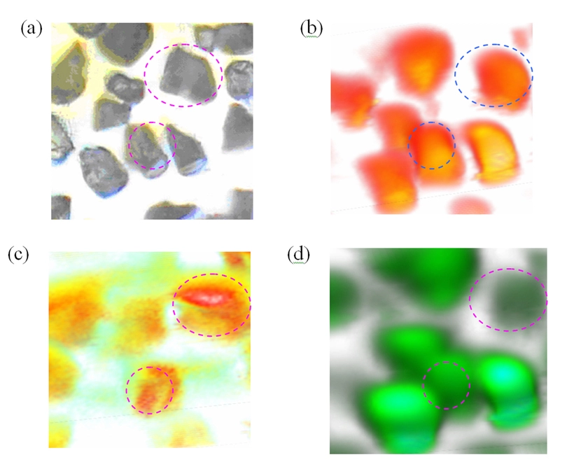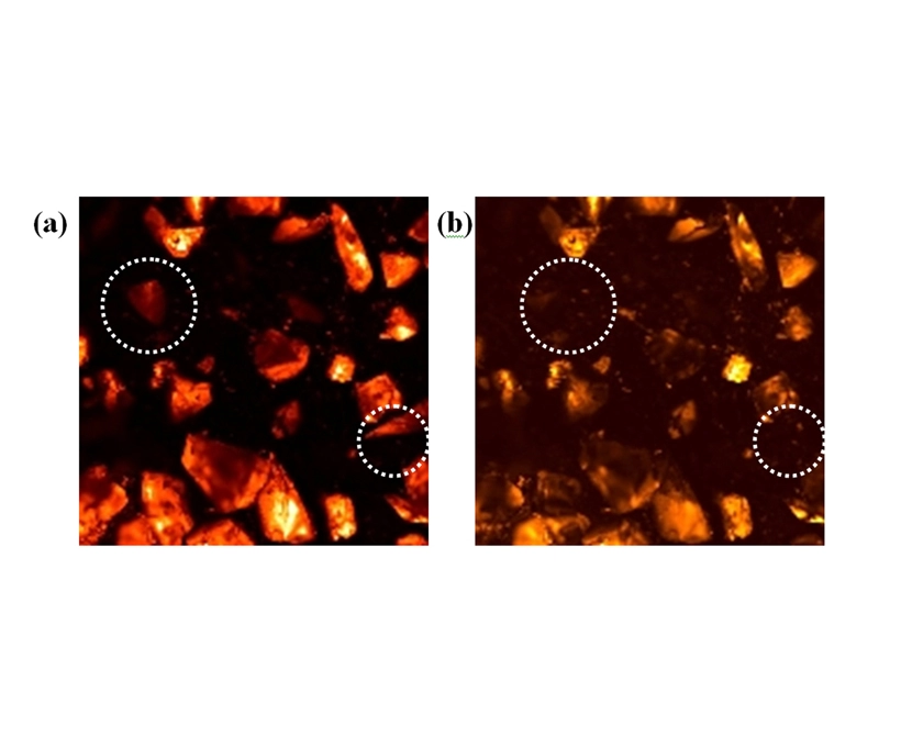 The investigated tool contains diamond grains fixed on the functional part via a bonding material. Approximate micron range of diamond micro-crystals is 15 – 25 µm Raman and NV photoluminescence images of tool (150×150 µm) are shown in Fig.2. It is possible to see from the experimental data, there is homogeneous distribution of diamond grains along the working surface of a tool (Fig.2a). From analysis of the intensity of NV photoluminescence peak (Fig.2b) we can conclude that diamond crystals have got varied contents of defects. Some of crystals include a small amount of defects. Such crystals are marked with the white circles in Fig.2.
