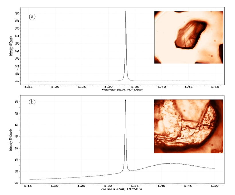 Raman spectrum of a stress free diamond microcrystal contains a sharp peak at 1332 cm-1 (Fg.1a). The full width at half maximum (FWHM) of this peak is ~1.7 cm-1. Any deviation from the “perfect” parameters may be indicative of the presence of strain in diamond. Complimentary to the Raman spectroscopy, the broadband photoluminescence peak (Fig.1b) is associated with color NV centers. The intensity of peak shows defects concentration in diamond crystals.